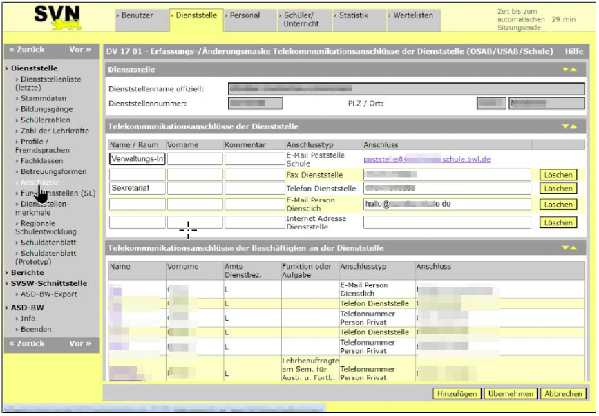 Diese übertragene Mail-Adresse kann über den Schulleitungszugang in ASD-BW unter Dienststelle > Anschlüsse geändert oder gelöscht werden.