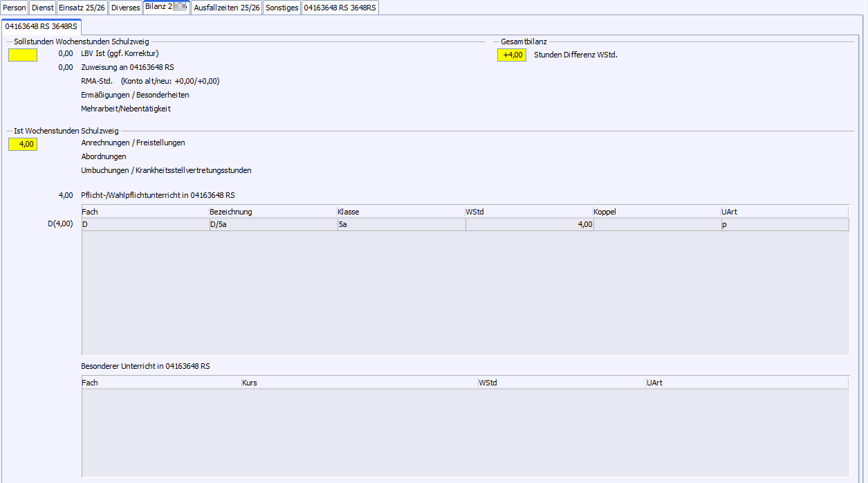 Auf dem Reiter mit dem Dienststellenschlüssel der Schule werden der Unterricht an der Schule, evtl. Aufgaben und Sonderfunktionen und die Reduktionen an dieser Schule hinterlegt.
