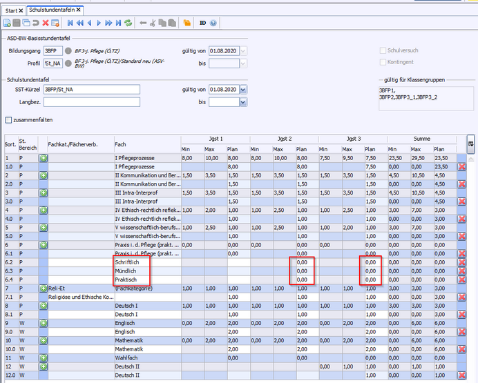 •Bildungsgänge: 3BFP, Jahrgangstufe 3; BFPL, Jahrgangstufe 4 •Modulbezogene Funktion: Fächer aus Stundentafel übernehmen: Die Fächer können sowohl aus der Stundentafel zu 3BFP als auch zu BFPL übernommen werden. •Entfernen Sie alle Fächer außer den Prüfungsteilen Schriftlich, Mündlich und Praktisch. • Fügen Sie die die Zusatzkategorien Durchschnitt 3, bestanden, Ausbildungsberuf, Bereich, Wirkdatum, Abgangsdatum und Bemerkungen hinzu. |