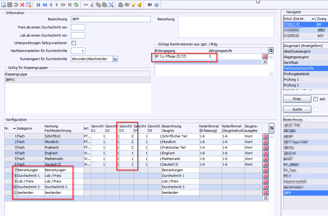 Navigation: Zeugnisse > Zeugniskonfiguration > Berufliche Schulen > BFS - Berufsfachschule 3BFP/BFPL |
