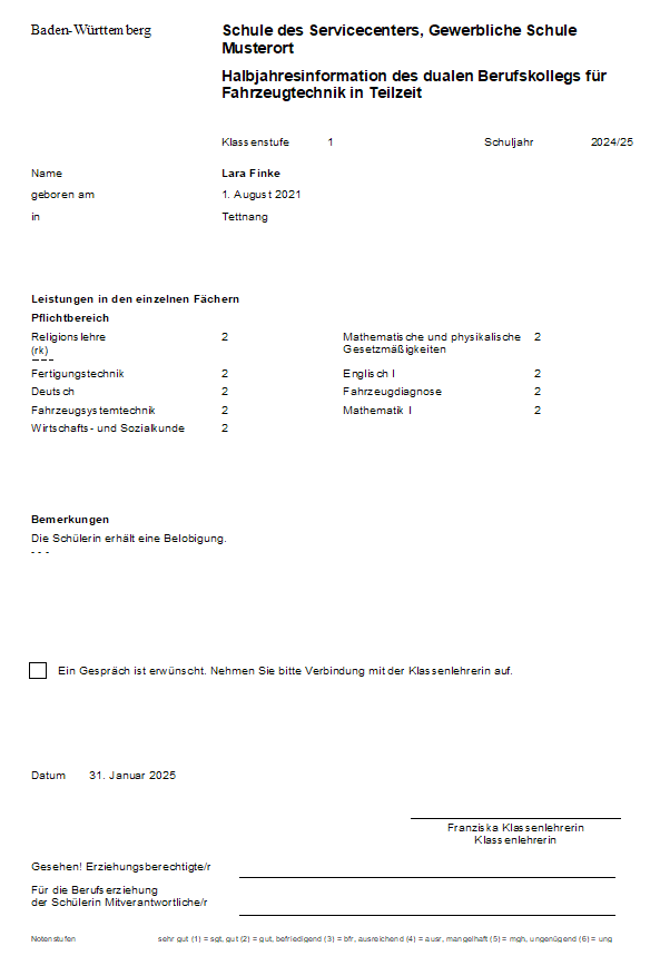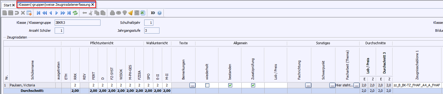 p Die unterschiedlichen Texte auf den Zeugnissen werden gemäß der in den Klassen zugewiesenen Stundentafeln erstellt. Siehe Voraussetzungen. Für die Erfassung von Einzelnoten bei zwei Abschlüssen (Assistent und Fachhochschulreife) können Sie die von uns bereitgestellten Notenblöcke verwenden. (Einstellungen Notenverwaltung) |