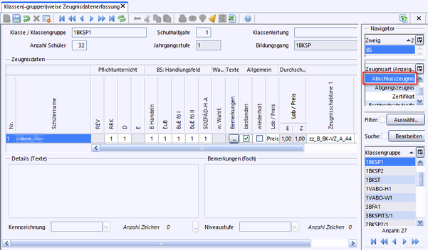 Im aktuellen Schuljahr ist in der klassengruppenweisen Zeugnisdatenerfassung zumindest die Note für die Gesamtnote des Berufspraktikums oder die Note des Kolloquiums (wenn vom Praktikum befreit) zu erfassen. Werden keine weiteren Noten eingetragen, werden diese aus dem Vorjahr zur Zeugnisart ASA entnommen.