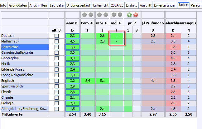 Für die zz Anmeldeliste mdl. Prüfung D, M ist es erforderlich, im Schülermodul unter dem Reiter Noten das Prüfungsfach in der Spalte mdl. P. mit einem Notenplatzhalter "-" zu versehen. |